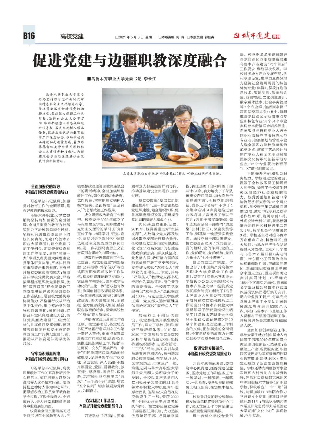 乌鲁木齐职业大学党委始终坚持以习近平新时代中国特色社会主义思想为指导,坚决贯彻落实新时代党的治疆方略,聚焦聚力新疆工作总目标,坚持社会主义办学方向,牢牢把握意识形态领域绝对领导权,落实立德树人根本任务,促进基层党建与教育教学 工作深度融合,推动学校内涵建设和高质量发展,着力培养德智体美劳全面发展的社会主义建设者和接班人,为新疆维吾尔自治区经济社会发展作出积极贡献。
