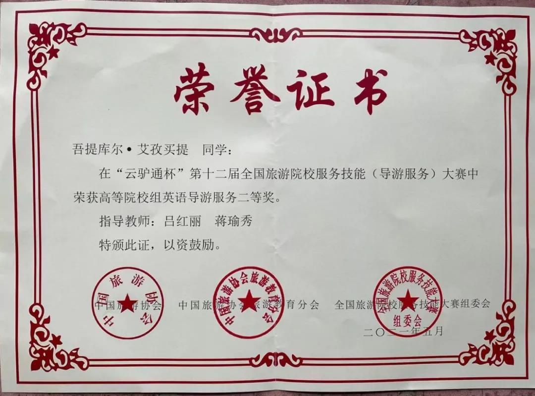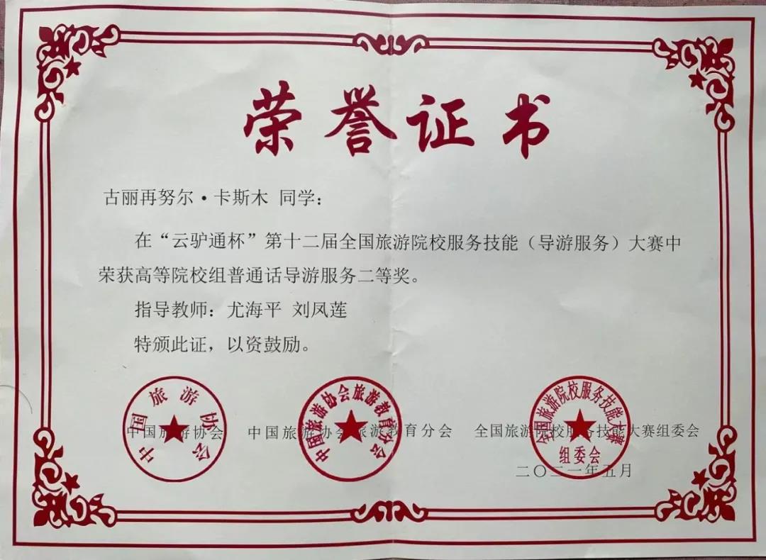 近日,“云驴通杯”第十二届全国旅游院校服务技能(导游服务)大赛在青岛圆满落下帷幕。我校旅游学院旅游管理1803班学生古再丽努尔·卡斯木荣获高等院校组普通话导游服务二等奖、外国语学院英语教育1751班学生吾提库尔·艾孜买提荣获高等院校组英语导游服务二等奖、外国语学院旅游英语1905班陈思达荣获高等院校组英语导游服务三等奖。