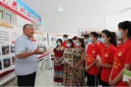 7月13日上午,实践团成员拜访了自治区民族团结先进个人霍一清。访谈中,霍一清向实践团成员讲述了自己帮助哈萨克族大妈库里吉肯一家30余年的故事,希望团员们能够继续发扬艰苦奋斗的作风,坚持把民族团结优良传统传承下去。在场团员深受感动,纷纷表达了自己对霍一清的崇敬之情,还邀请霍一清共跳新疆少数民族舞蹈。7月14日上午,实践团全体成员走进全国民族团结进步模范马丁别克·木拉提汗工作室。在展厅内,马丁别克·木拉提汉向实践团成员们谈起创办工作室的初衷——尽己所能帮助有困难的人。实践团成员现场弹唱歌曲《我的祖国》,表达对民族团结先进模范的敬意。